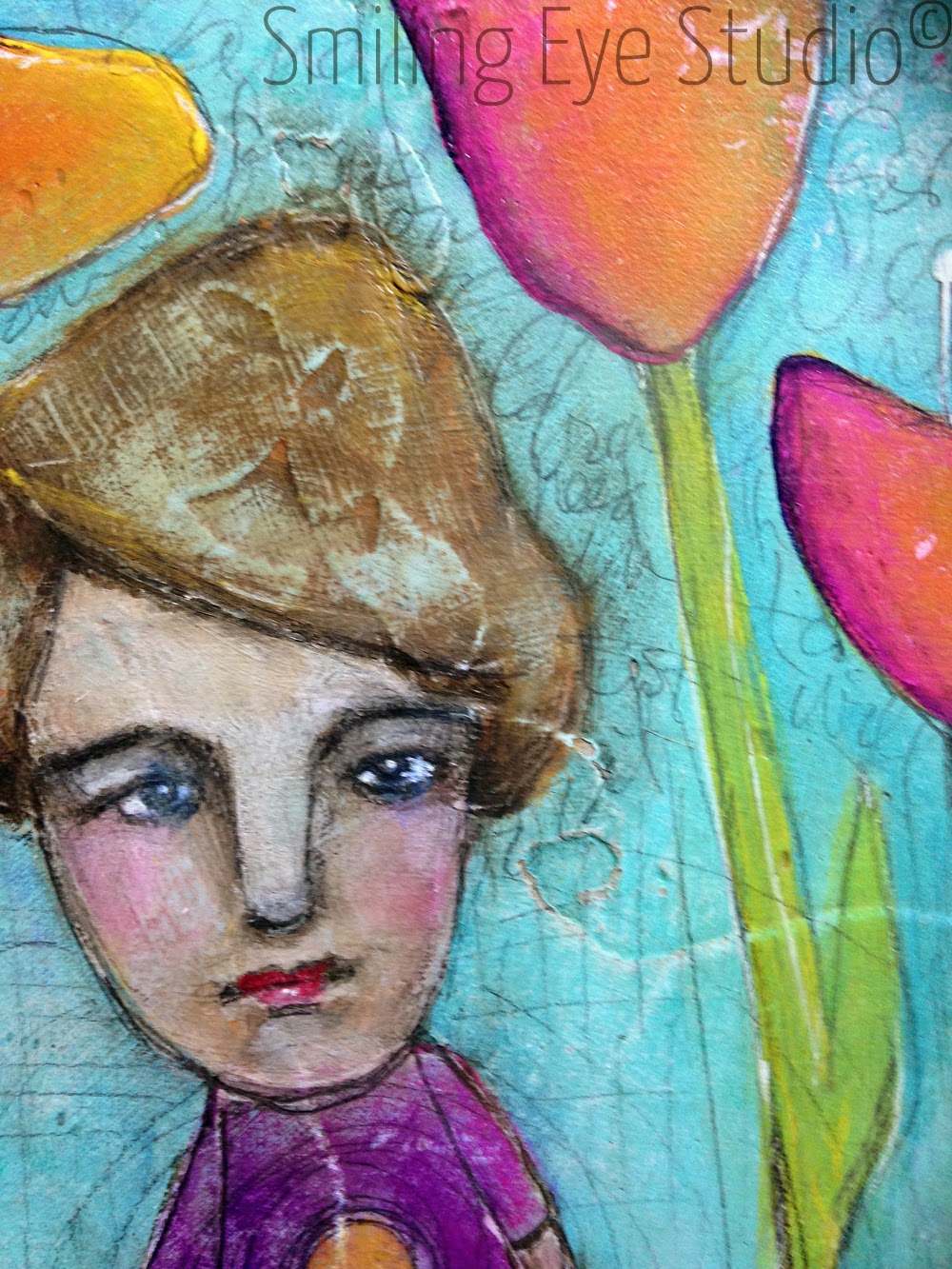 Using a drawing pencil to scribble some journaling in the background and to draw around the flowers. It's all about layers of texture! BTW, don't you just love the texture where her face used to be? That is from the plaster. Delish!